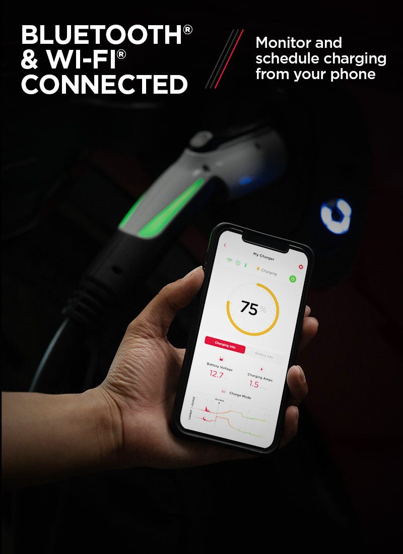 The SEV16001450 is compatible with most North American electric vehicles thanks to its SAE-J1772 (universal) connector. However, Tesla® vehicles will require an adapter (sold separately). The charger is extremely simple to use. Just plug the unit’s charging gun into the EV charging port and charging is automatic. Built-in Wi-Fi® and Bluetooth® allows users to monitor and schedule charging through the SchuPower™ app.